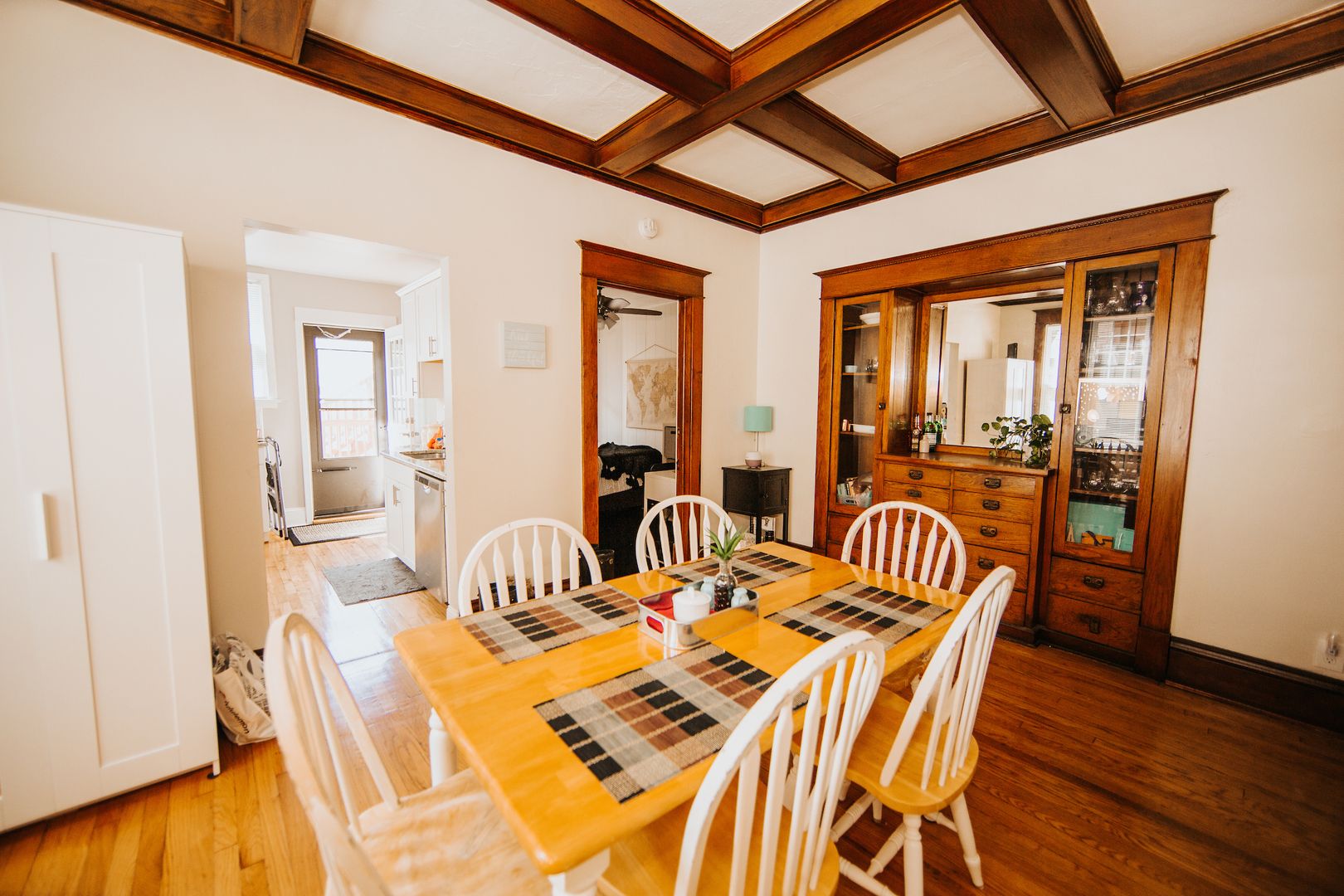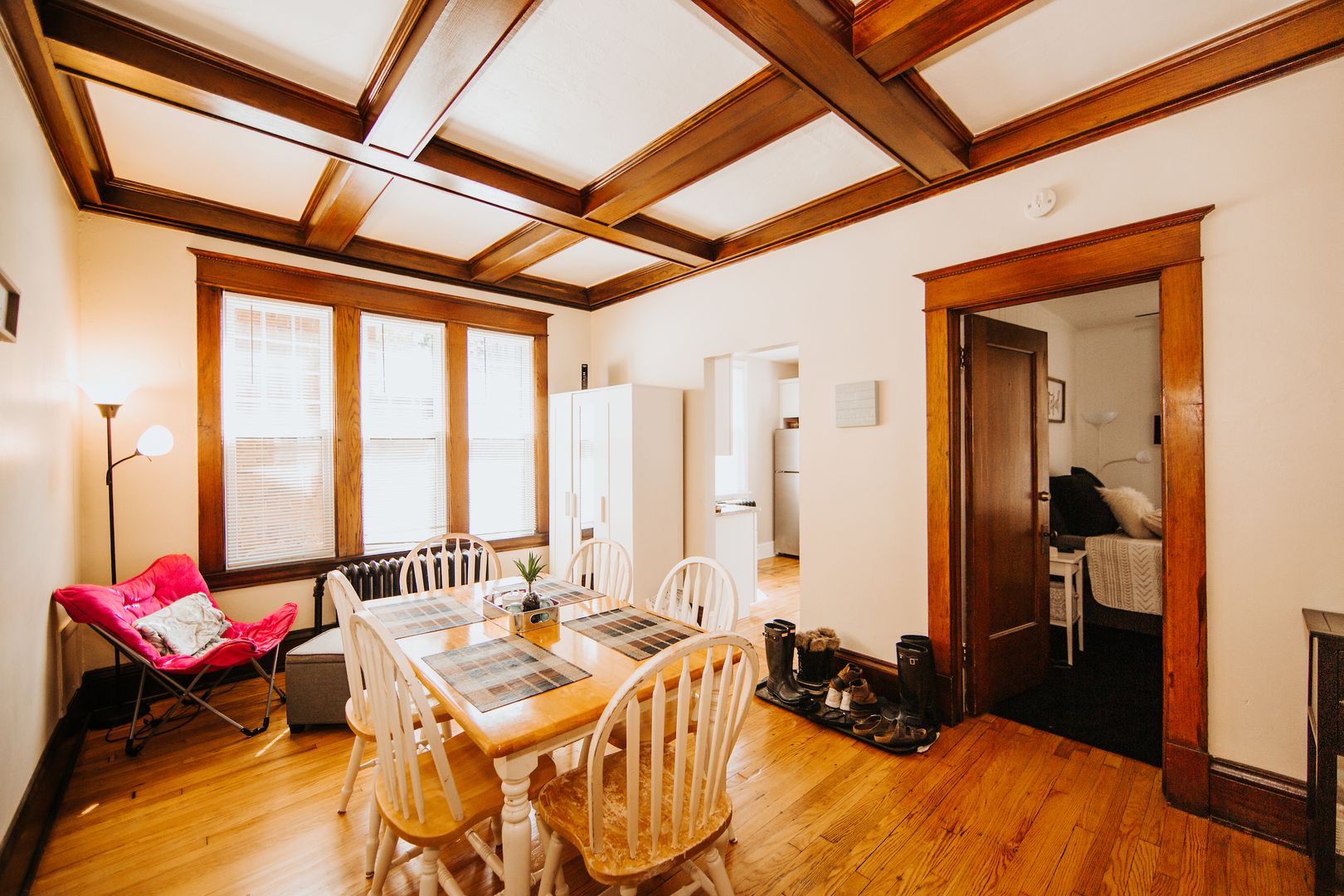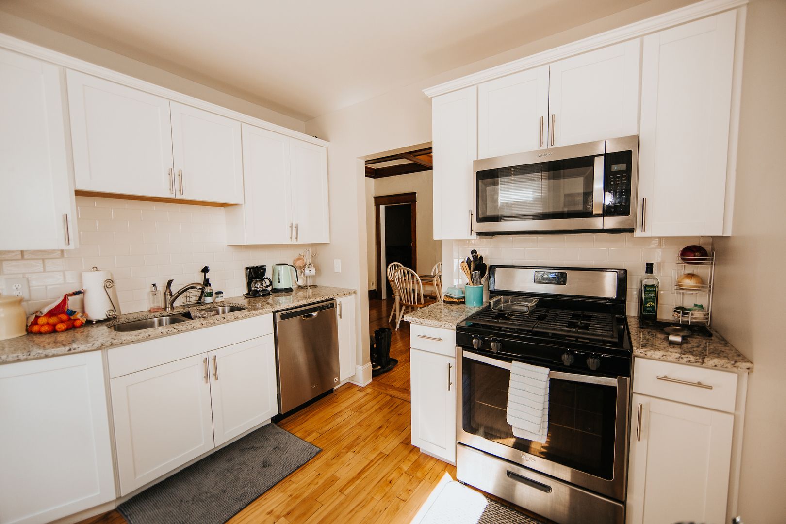 Enjoy the benefits of an updated kitchen (granite countertops, stainless appliances, dishwasher, large fridge, deep sink) with all the original charm of this gorgeous unit: refinished hardwood floors, massive living and dining rooms, high ceilings, original wood beams and built-ins throughout. Bedrooms are spread out nicely for privacy!