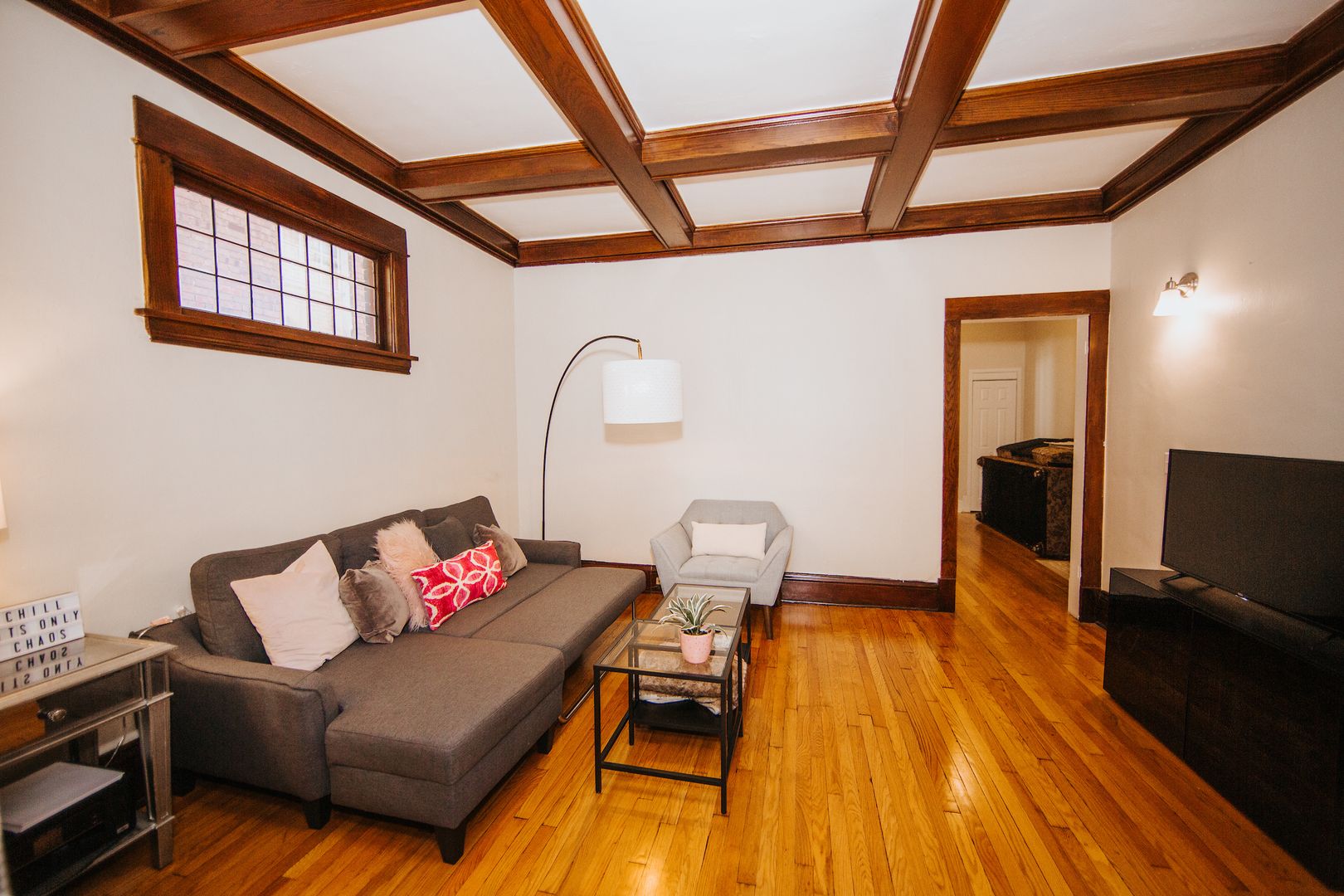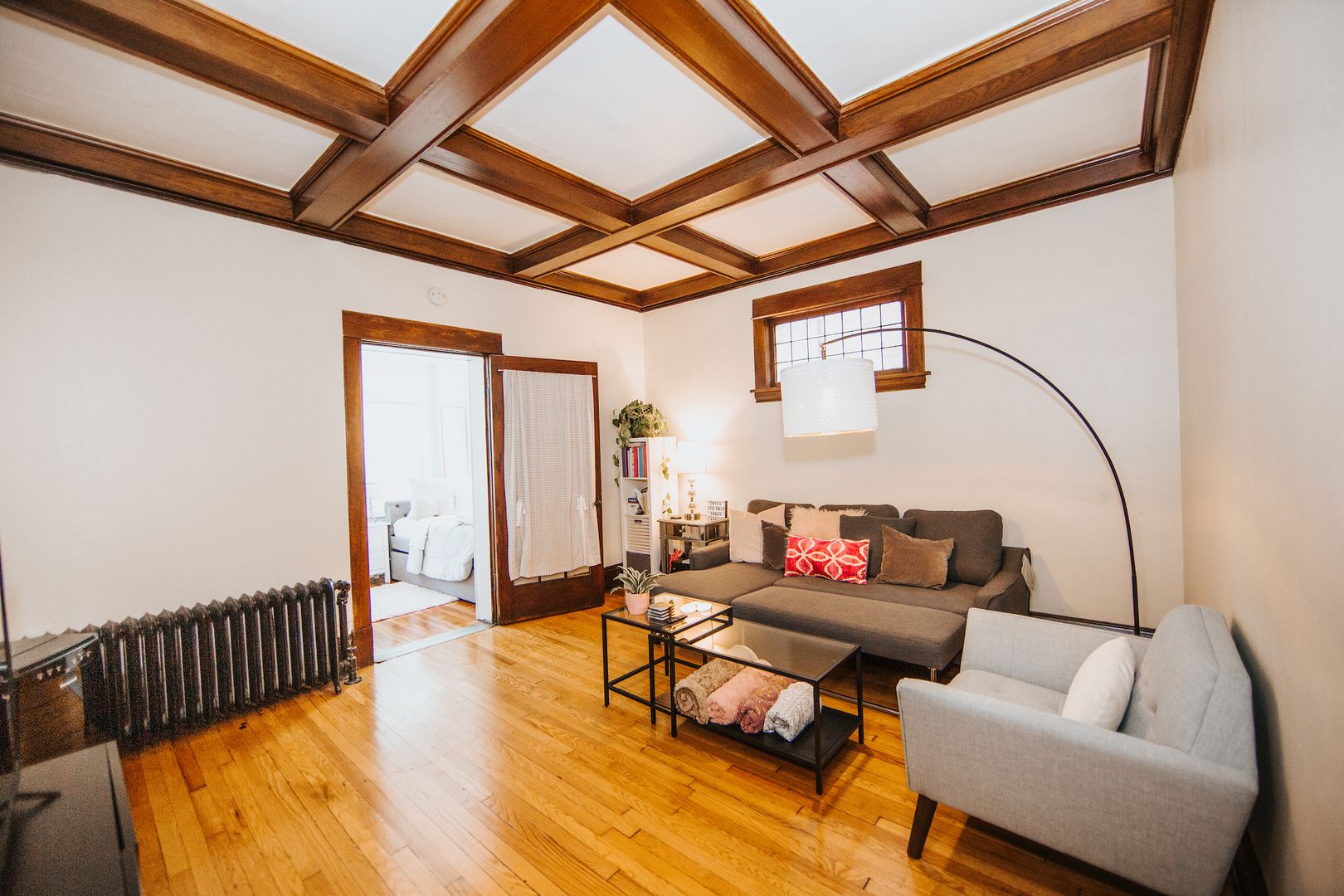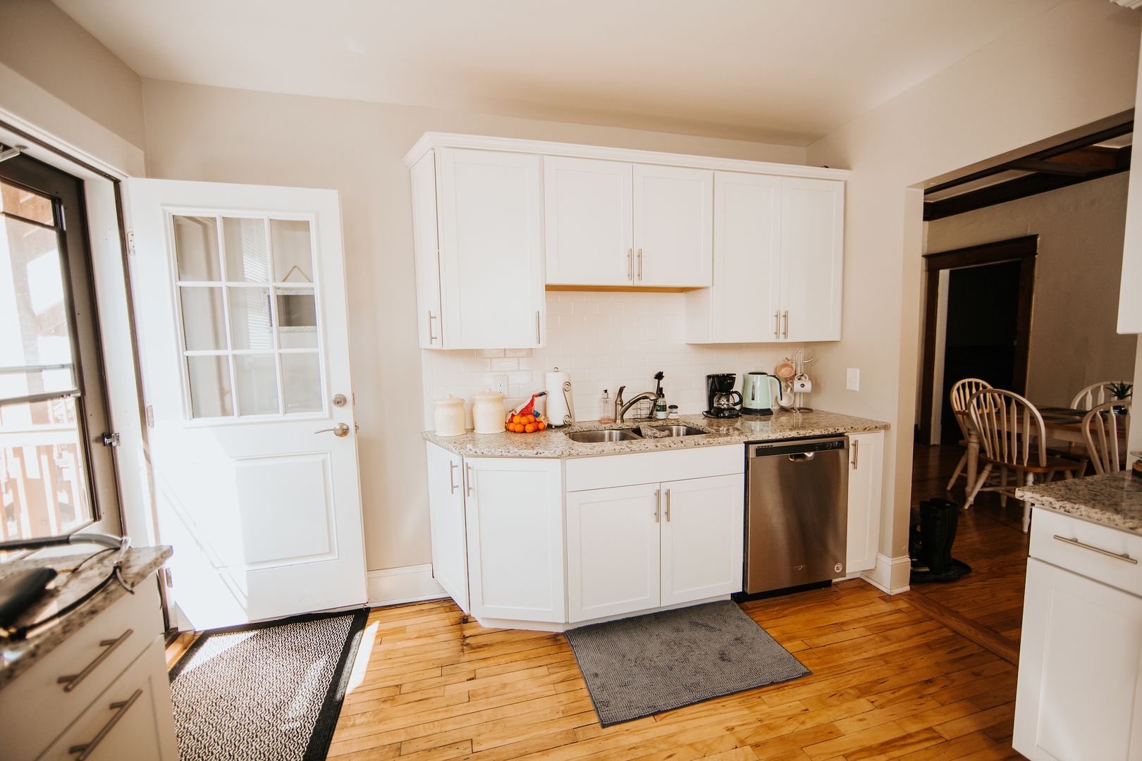 Enjoy the benefits of an updated kitchen (granite countertops, stainless appliances, dishwasher, large fridge, deep sink) with all the original charm of this gorgeous unit: refinished hardwood floors, massive living and dining rooms, high ceilings, original wood beams and built-ins throughout. Bedrooms are spread out nicely for privacy!